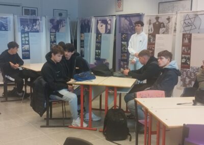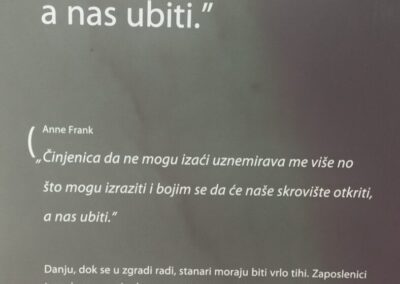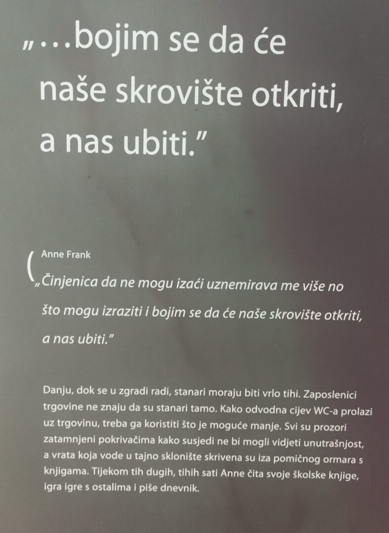 U srijedu, 18. 3. 2026.g. posjetili smo međunarodnu izložbu „Anne Frank – povijest za budućnost“ u Prirodoslovnoj školi u Splitu, gdje su nas dočekali i kroz izložbu proveli učenici – volonteri iz Prirodoslovne škole, posebno obučeni za ovu prigodu. Kroz niz edukativnih panela upoznali smo život Anne Frank i njene obitelji tijekom Drugog svjetskog rata. Prikazan je njen bijeg iz Njemačke u Amsterdam, skrivanje od nacista te pisanje dnevnika koji je postao simbol stradanja tijekom Holokausta. Posebno su nas se dojmili dijelovi o životu u tajnom skrovištu i stalnom strahu od odvođenja u smrt. U ovim uvjetima Anne je zadržala nadu i vjeru u bolje sutra, što nas je potaknulo na razmišljanje. Bez tolerancije i poštivanja ljudskih prava nema dostojanstvena života kakav zaslužuje svaki pojedinac. Diskriminacija i širenje mržnje velika su opasnost za društvo.